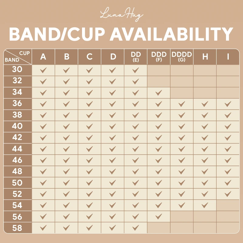 LunaHug bra fits true to size, offering a comfortable and supportive fit. We recommend you select your regular size.